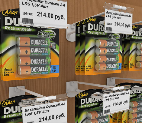Подвешивается на T-образные одинарные или двойные металлические крючки. При снимании товара с крючка откидывается вверх, затем возвращается в исходное положение. Высота ценникодержателя 39 мм.