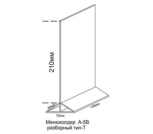 МЕНЮХОЛДЕР ФОРМАТА А-5, С НИЖНЕЙ ЧАСТЬЮ РАЗЛИЧНЫХ ЦВЕТОВ, КЛАСИЧЕСКОГО ВИДА. СОСТОИТ ИЗ ДВУХ ЧАСТЕЙ, ПРОЗРАЧНОГО Т-ОБРАЗНОГО ПЛАНШЕТА И НИЖНЕГО ДЕРЖАТЕЛЯ, ТРЕУГОЛЬНОЙ ФОРМЫ. ПОДХОДЯЩИЕ ИЗДЕЛИЕ, ПРИ НЕОБХОДИМОСТИ ПО ОСОБЕННОМУ ВЫДЕЛИТЬ ИНФОРМАЦИЮ.