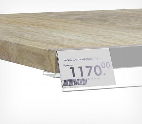 Полочный ценникодержатель на деревянные и другие полки толщиной 14-30 мм. Внутренняя поверхность крепления к полке, имеет силиконовые удерживающие насечки, не портит покрытие деревянных полок.