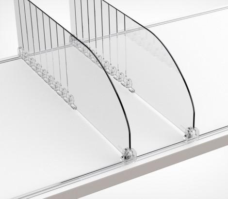 Разделитель DIV120-В выс.120 мм без ограничителя - предназначен для организации выкладки небольших лёгких товаров, таких как сигареты, лекарства, парфюмерия и косметика. материал: прозрачный ударопрочный пластик, имеет насечки с шагом 25 мм для обламывания по длине. Особенности: подходит для полок глубиной 200–400 мм. Задняя часть разделителя разделена на фрагменты, которые можно отрезать, чтобы регулировать длину. Для крепления на полку нужны специальные профили, которые фиксируются на переднюю и заднюю стороны полки. На передней и задней части разделителя есть вырезы (замки) для фиксации на профиль.