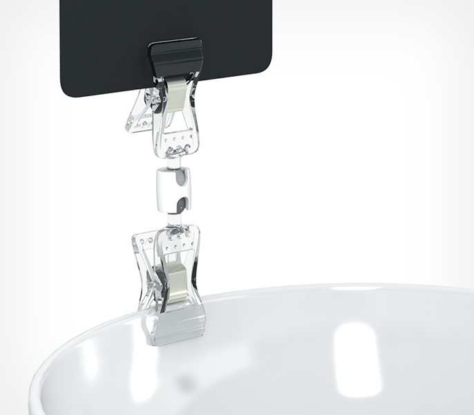 Универсальный ценникодержатель с прищепками, малый надевается на торец полки, край коробки, корзины, блюда, толщиной до 10 мм.
