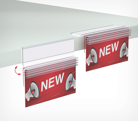 Может использоваться как ценникодержатель, особенно в случаях, когда невозможна установка на торце полки. Длина 25 мм. Прочное крепление без сверления, аккуратный внешний вид и улучшенная видимость за счёт наклонного угла делают SGFD-FLEX идеальным выбором для магазинов, выставок и торговых точек.