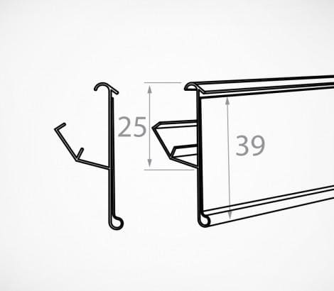Ценникодержатель для стеллажей MODERN EXPO и КС РУСЬ. Обеспечивает надёжное крепление на краю полки, возможна установка под 2-мя разными углами к поверхности полки (рекомендуется устанавливать ценникодержатели на нижних полках под более острым углом к поверхности полки).